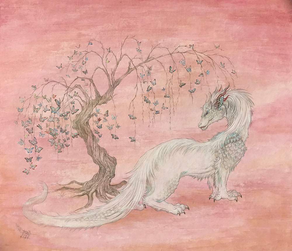 ある日、花も葉も無く種類も分からない木を見かけた。その日の夜、夢にあらわれた龍と蝶がモチーフ。