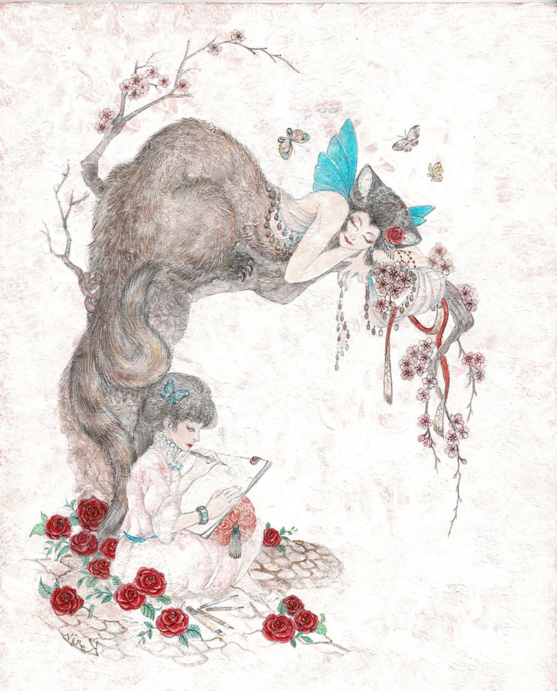 幼少期に京都で見た災厄よけの「護るために存在する神獣」たちに感銘を受け、不思議な生き物たちと日本画に興味を持つ。
